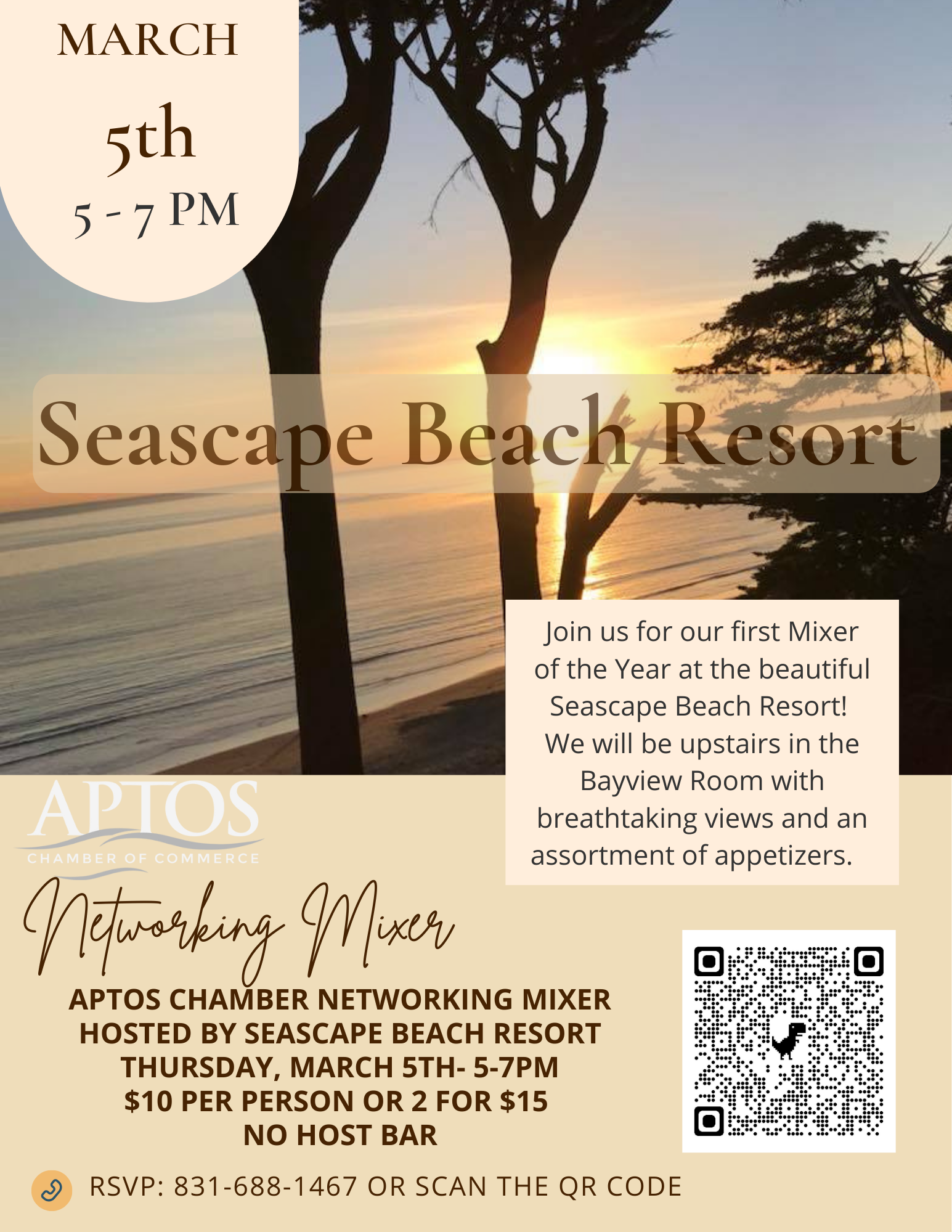 March 5 @ 5:00 pm - 7:00 pm Seascape Beach Resort Networking Mixer Seascape Beach Resort 1 Seascape Resort Drive, Aptos, CA, United States $10
